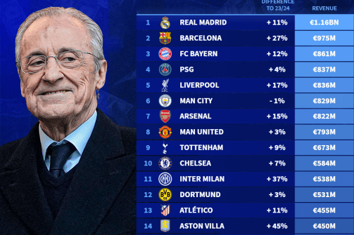 俱乐部收入排行:皇马11.6亿欧居首 曼联跌至总榜第八